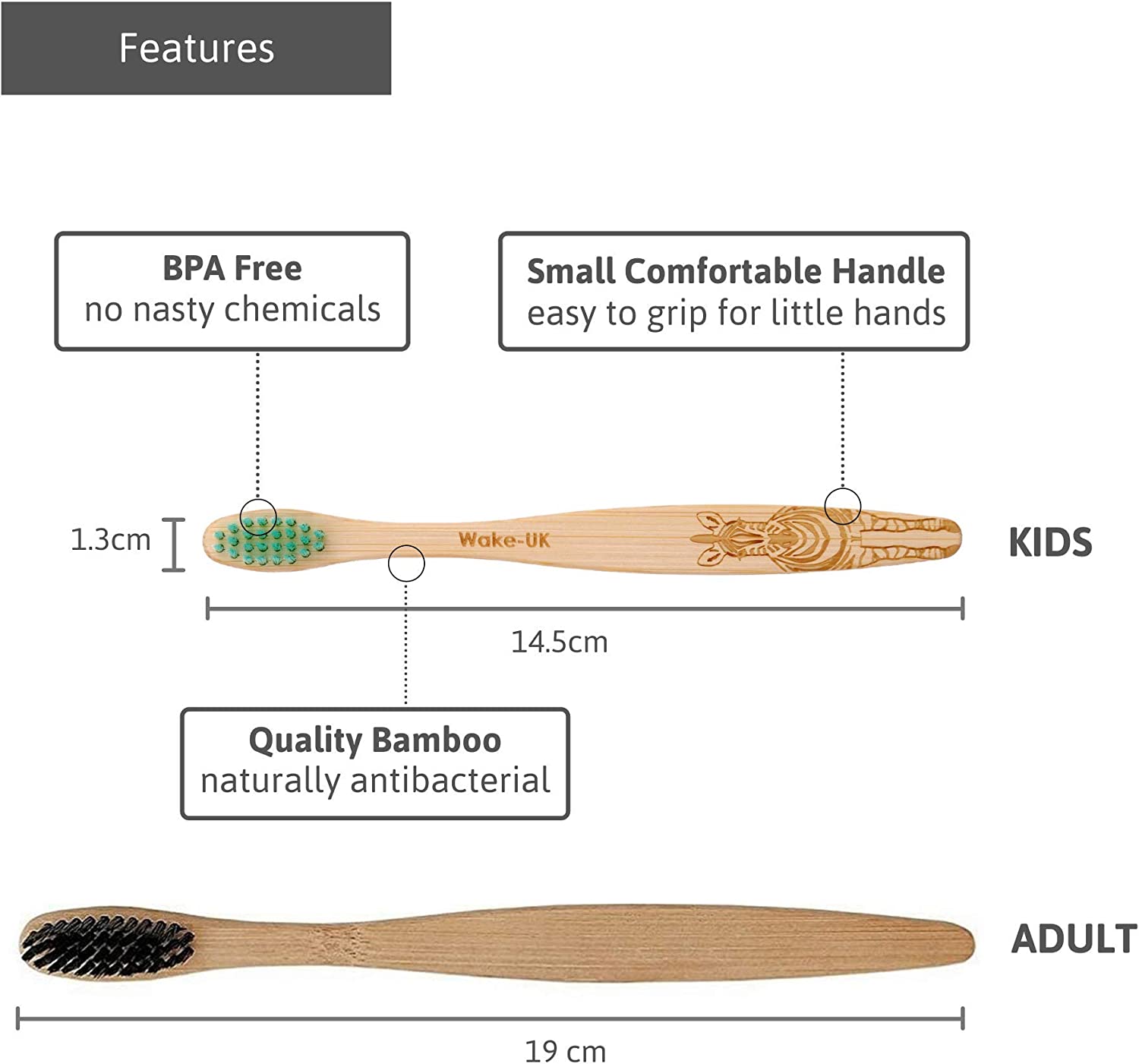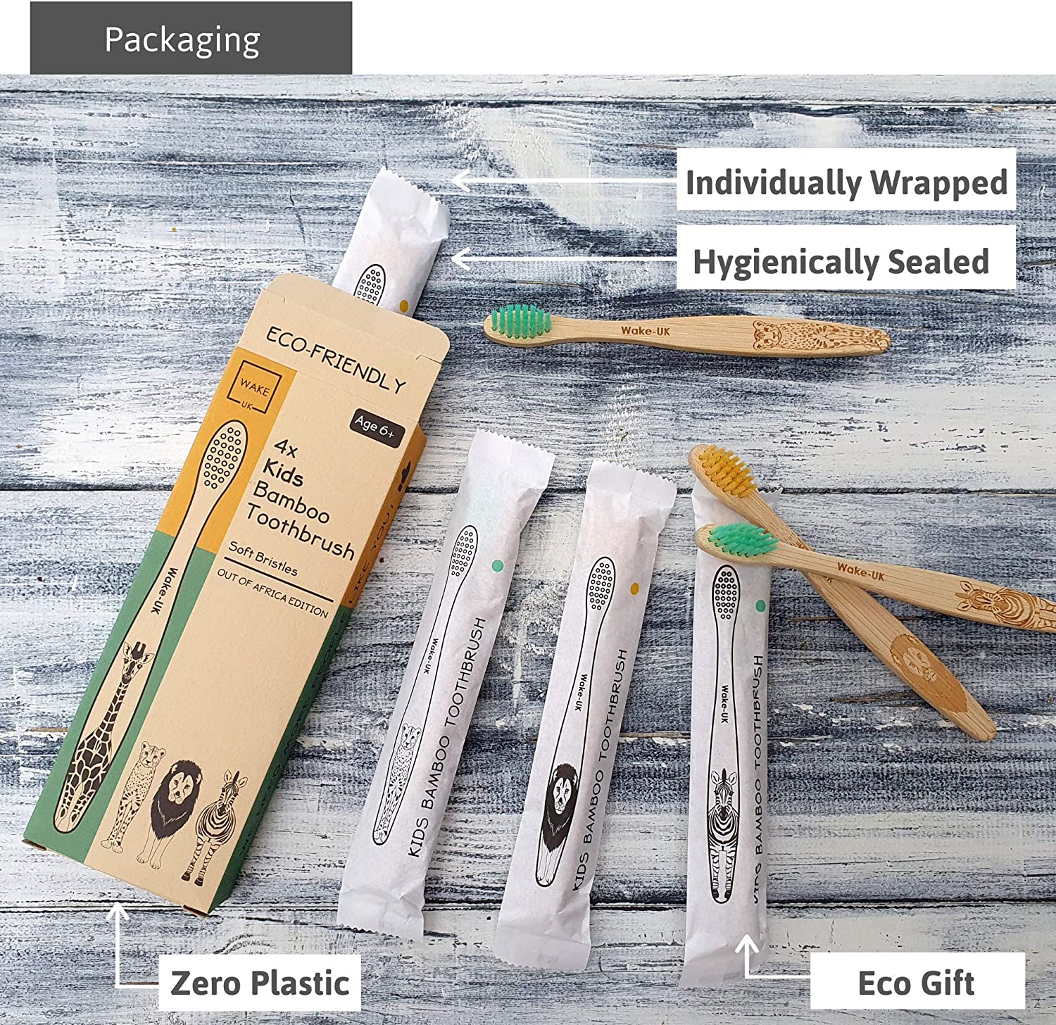 ✅ DESIGNED FOR KIDS–Kids Toothbrushes Age 6+, individually sealed with soft tapered bristles for healthy teeth & gums. 4 African animal designs so choose your favourite. Our Kids Bamboo Toothbrushes have a smaller size handle and head for little hands and mouths, comfortable and easy to hold flat handle and individually sealed for hygiene. Bamboo is a natural product, BPA-free, and free from any other nasties. Tested and approved by kids, we know they will love our Kids Bamboo Toothbrushes